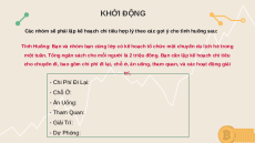 cho chuyến đi, bao gồm chi phí đi lại, chỗ ở, ăn uống, tham quan, và các hoạt động giải trí. - Chi Phí Đi Lại: - Chỗ Ở: - Ăn Uống: - Tham Quan: - Giải Trí: - Dự Phòng: BÀI 8: LẬP KẾ HOẠCH CHI TIÊU Giáo Dục Công Dân 8 NỘI DUNG BÀI HỌC