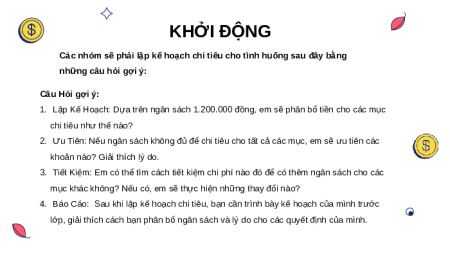 Các nhóm sẽ phải lập kế hoạch chi tiêu cho tình huống sau đây bằng