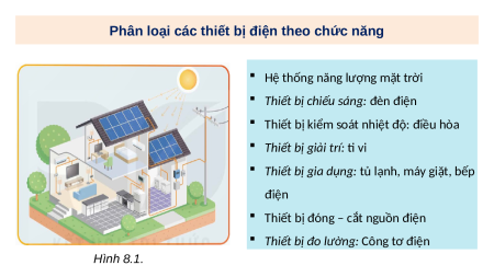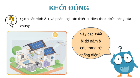 Quan sát Hình 8.1 và phân loại các thiết bị điện theo chức năng của chúng. Vậy các thiết bị đó nằm ở đâu trong hệ thống điện?