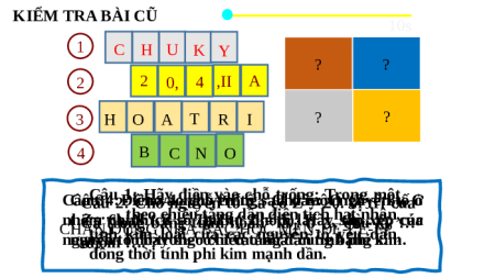 Bài giảng Hóa học 10 KIỂM TRA BÀI CŨ 10s 1 C H U K Y ? ? 2 2 0, 4 ,II A 3 H O A T R I ? ? 4 B C N O