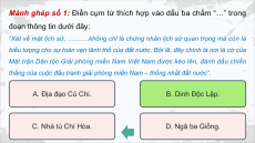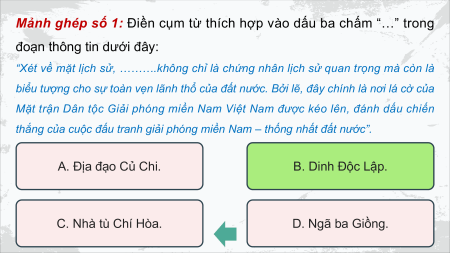 thắng của cuộc đấu tranh giải phóng miền Nam – thống nhất đất nước”. A. Địa đạo Củ Chi. B. B .D i D nh n h Đ ộ Đ c ộ c L ậ L p ậ . p C. Nhà tù Chí Hòa. D. Ngã ba Giồng.