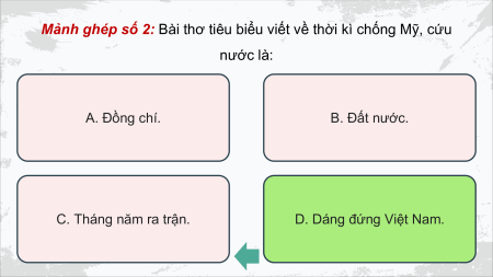 Mảnh ghép số 2: Bài thơ tiêu biểu viết về thời kì chống Mỹ, cứu nước là: A. Đồng chí. B. Đất nước. C. Tháng năm ra trận. D. D .D á D n á g n g đ ứ đ n ứ g n g V i V ệt ệ tN a N m a . m
