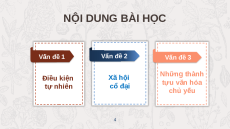 thành, phát triển nền văn minh Ấn Độ cổ đại? 3 NỘI DUNG BÀI HỌC Vấn đề 1 Vấn đề 2 Vấn K đề 3 Những thành Điều kiện Xã hội tựu văn hóa tự nhiên cổ đại chủ yếu 4