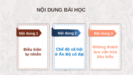 trong việc hình thành, phát triển nền văn 3 minh Ấn Độ cổ đại? NỘI DUNG BÀI HỌC Nội dung 1 Nội dung 2 Nội dung 3 K Những thành Điều kiện Chế độ xã hội tựu văn hóa tự nhiên