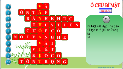Trường: THCS LƯƠNG THẾ VINH-QUY NHƠN-BÌNH ĐỊNH I. KHỞI ĐỘNG 1 ? V ? À Từ khóa 2 ? Ô ? N ? T ? Ậ Ă ? P 3 ? B ? Á ? N ? H ? K ? H ? Ú ? C 1 23 45 6 78 9 1011 4 ? T ? H ? Ủ ? Y ? T ? I ? Ê ? N TĐi Cu Mì Điộ Lo Kiạ Ngể Haề ề ốt i m i M n i lo ườ u đ n b s u ố ột ộ t mừừ ỗ ại àt à i i i hoa n vév b“ ừ“ ra àt à ch á mtr Vi sđo ủ ệ chơi o v ế ứẹ ch đi nh ao t pc ề c chđ ongk ỗcỗ ểóđộ ổ éủ … m mi i văn o … a ù nh danh c m câu bđ i ủ : ảểa ột n dân “ c“Đ ủ m cá Sa tư di T ể thưìờ a u ờ tộ c svó ng thơm t ứ nh v ch x à ng chuy rong m c ừgi ờ i tr ểì gi ta ộ óả ây ng n ? t dà nh ao ( ch kiể rau i cây ựy ” ti r tâmế 10 ậ u khc ng thè u b ú may ờ , ì đi p ể ch hoa à mđi c ? ắ trặ ch ư ú ̃ ( n tôn t m cvá 8 , ên n cho ề ng i) 5 ? C ? Ư ? Ớ Ó ?P ? C ? Ờ thu họ ch th trịọ ng ta ph ỷ c ữ tay ửk íc ltiên n ỹ a ầ à c nh à ng a đ o ác n i) vư th á ủ ội đ ? ợắ c … ẹ (ý năng mì c p 5 ng hoa g á ì ngư ch v ki c à cu ế nh lý ữ ? h ộ n lên ( àki ờ c ạ c. v 4 trế i á Đ khàò ta i) nh ó á n c chữ 6 ? N ? Ó ?I ? V ? À A ? N ? G ? H ? l E bi đc ph ph à khú ặá tr ệt t i) chơ á ả c ò vi c i tr “ r àgìtr è o bi ả d ? ệ i qua khâu ong ụ( t ” chơi nh g 5 ? ì ng ữ n cho tc ch ng ? ( ụ ữ 6 a k cỹá ch i) ữ c ngâ ngà á dư y i) năng ỡ m đầ gì ng nư u x ? … (ớ ? ( 8 c 9 3 … uân chch chữg ? ữ ọ (c ữ t 8 áci) ái) 7 ? V ? À ?I ch qu ữ ả c ” ái)(2 chữ cái) 8 ? V ? I ? Ế ? T 9 ? K ? É Ệ ? O ? C ? O 10 ? T ? Ô ? N ? T ? R ? Ọ ? N ? G