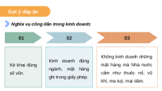 Nghĩa vụ công dân trong kinh doanh: 01 02 03 Không kinh doanh những Kinh doanh đúng Kê khai đúng mặt hàng mà Nhà nước ngành, mặt hàng số vốn. cấm như thuốc nổ, vũ ghi trong giấy phép. khí, ma tuý, mại dâm.