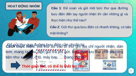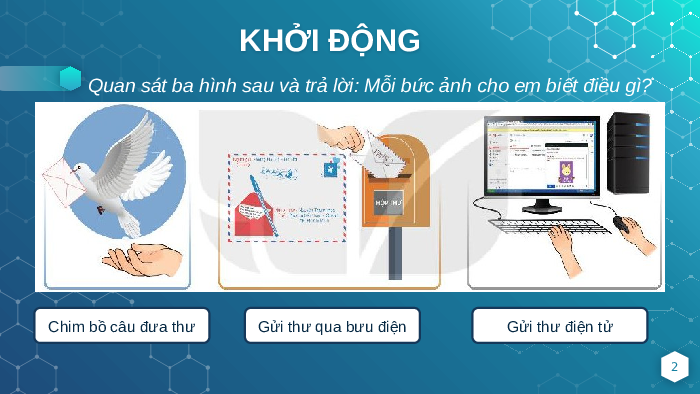 Quan sát ba hình sau và trả lời: Mỗi bức ảnh cho em biết điều gì? Chim bồ câu đưa thư Gửi thư qua bưu điện Gửi thư điện tử 2