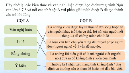 Hãy nhớ lại các kiến thức về văn nghị luận được học ở chương trình Ngữ