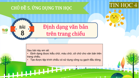 CHỦ ĐỀ 5. ỨNG DỤNG TIN HỌC BÀI Định dạng văn bản 8 trên trang chiếu Sau bài này em sẽ: