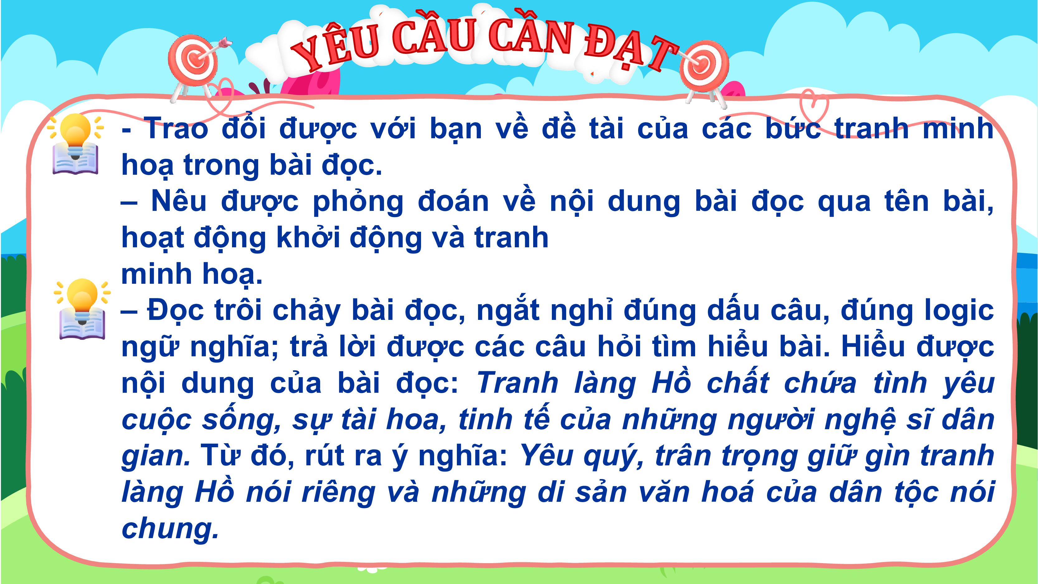 - Trao đổi được với bạn về đề tài của các bức tranh minh hoạ trong bài đọc.