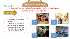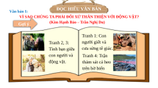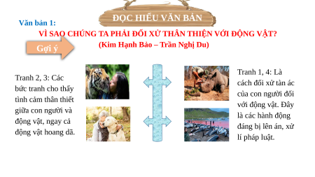 (Kim Hạnh Bảo – Trần Nghị Du) Gợi ý Tranh 1: Con Tranh 2, 3: người giết và Tình bạn giữa cưa sừng tê giác. con người và Tranh 4: Trận động vật. thảm sát cá heo trên bờ biển