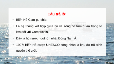 • Hãy chia sẻ một số hiểu biết của em về các địa danh đó. Câu trả lời - Biển Hồ Cam-pu-chia: