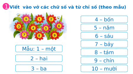 1 Viết vào vở các chữ số và từ chỉ số (theo mẫu) 4 – bốn 5 – năm 6 – sáu 7 – bảy Mẫu: 1 – một 8 – tám 2 – hai 9 – chín 3 – ba 10 – mười