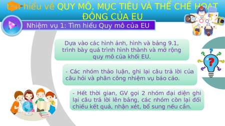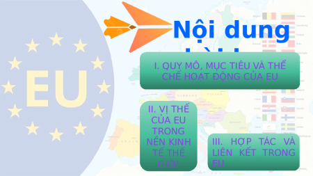 đạt điểm 10 và giảm dần điểm về LIÊN MINH CHÂU số theo thứ tự. Lượt 2: cử đại Lượt 1: ÂU diện ghi bảng thảo luận, các thông tin ghi thông ghi trên giấy tin vào (để tăng tốc, giấy A4, có thể cho 2 mỗi thông bạn ghi hoặc 1 tin không bạn đọc 1 bạn quá 1 ghi,... miễn dòng tập. sao đội mình nhanh nhất có thể). Nội dung I. QUY bài học MÔ, MỤC TIÊU VÀ THỂ CHẾ HOẠT ĐỘNG CỦA EU II. VỊ THẾ CỦA EU TRONG NỀN KINH III. HỢP TÁC VÀ TẾ THẾ LIÊN KẾT TRONG GIỚI EU
