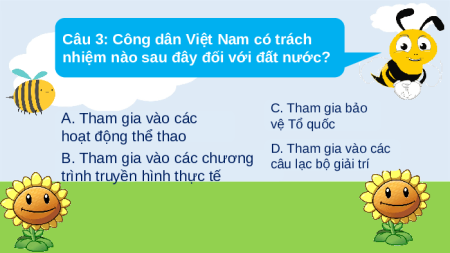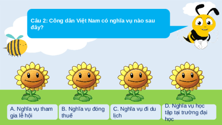 Câu 2: Công dân Việt Nam có nghĩa vụ nào sau đây? D. Nghĩa vụ học A. Nghĩa vụ tham B. Nghĩa vụ đóng C. Nghĩa vụ đi du tập tại trường đại gia lễ hội thuế lịch học