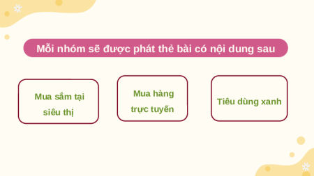 Mỗi nhóm sẽ được phát thẻ bài có nội dung sau Mua sắm tại Mua hàng Tiêu dùng xanh siêu thị trực tuyến