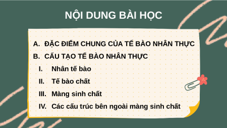B. CẤU TẠO TẾ BÀO NHÂN THỰC I. Nhân tế bào II. Tế bào chất III. Màng sinh chất