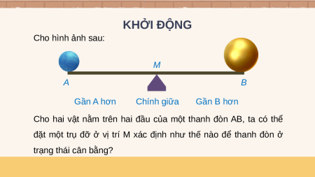 điểm M thuộc AB để nếu đặt trụ đỡ tại M thì thanh đòn ở trạng thái cân bằng.