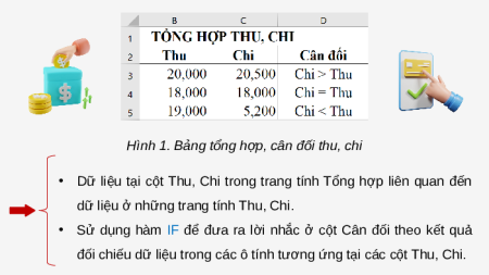 • Sử dụng hàm IF để đưa ra lời nhắc ở cột Cân đối theo kết quả