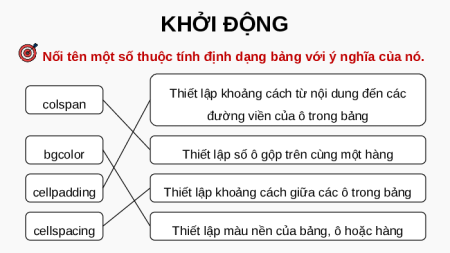 Nối tên một số thuộc tính định dạng bảng với ý nghĩa của nó.