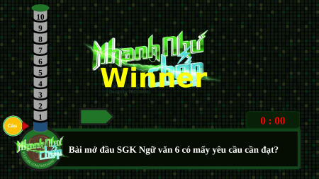 BẮT ĐẦU 10 9 8 7 6 5 Winner 4 3 2 1 210 10 : 0 : 5 : 4 : 3 : 2 : 1 0987654321 : 1 Câu Mô ChB n Bộ ún ài T Sáciế s g th Mô m ng a sẽ N n ở V ách g MN iệ đư ữ T đầ Sá t Ngợv ột êc u ởc gữ n c ữ tuv h r ănầấp vè m SGn 6n ăn ộ NK ti – t ể ăn luy 6 t gữ Nuệ Tv h n ập em c hể ọ giúp l ăn gữ c nh ó b đ chúnữ 1 ce 6 ư g oại nó m c văn ợ t ao tr ó c bn 6 a ubg g kĩ hi ph c ọ yệi là đan năn ao n ao ó h êu át n mim g tr nh g n tiế m ấyô hà êu iểà iê n ọ o be u họ c tr t N yê o ài g m nă tr u c n ữ gì ở ó hc g vầ tm ọc ng biết. ang? u êô ăn c c?cấp n h lựcín gT ần H là Ngữ h? ì? C gv đạtS? ì?ăn??
