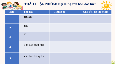 THẢO LUẬN NHÓM: Nội dung văn bản đọc hiểu Bài Thể loại Tiểu loại