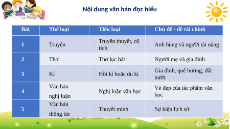 Chủ đề / đề tài chính Truyện 1 Thơ 2 Kí 3 Văn bản nghị luận 4 Văn bản thông tin 5