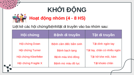 Liệt kê các hội chứng/bệnh/tật di truyền vào ba nhóm sau: Hội chứng Bệnh di truyền Tật di truyền Hội chứng Down Bệnh câm điếc bẩm sinh Tật dính ngón tay Hội chứng Turner Bệnh bạch tạng