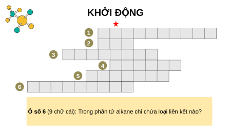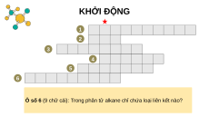 Ô số 3 (8 chữ cái): Dẫn xuất của hydrocarbon là loại hợp chất hữu cơ Ô ÔÔsố Ô số số1 2 số (10 (3 4 5 chữ chữ (6 chữ (7 chữ cái): cái): cái ): Đ Đ ây ây l là à một một Alkane có Alkene có l 4 loại oại chứa l hợp nhiên nguyên chất li tử ệu iên kết đôi hữu phổ carbon t cơ bi ến nên dễ có trong dùng rong phân t dàng l ử thành trong àm đờ gọi l mất i à mà Ô trong số 6 thành (9 chữ phần cái): T phân tử, ngoài rong phân t nguyên ử alkane chỉ tố carbon chứa loại l còn có iên kết nguyên nào? gì màu dung ? dịch nào? phần của các sống. loại giấm ăn.