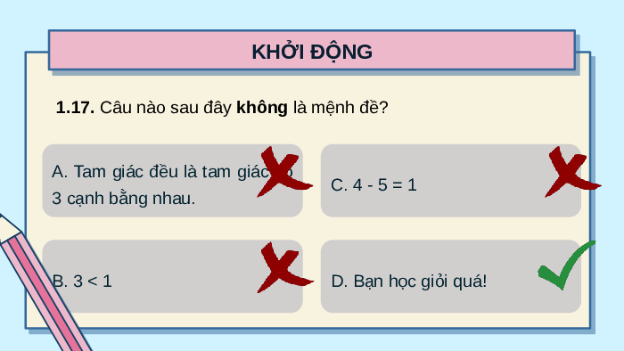 A. Tam giác đều là tam giác có C. 4 - 5 = 1 3 cạnh bằng nhau. B. 3 < 1 D. Bạn học giỏi quá!