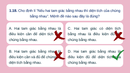 1.18. Cho định lí “Nếu hai tam giác bằng nhau thì diện tích của chúng
