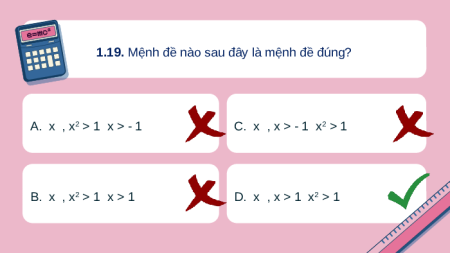 1.19. Mệnh đề nào sau đây là mệnh đề đúng? A. x , x2 > 1 x > - 1 C. x , x > - 1 x2 > 1 B. x , x2 > 1 x > 1 D. x , x > 1 x2 > 1