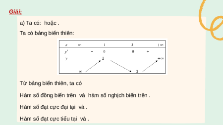 c) Vẽ đồ thị của hàm số. Giải: a) Ta có: hoặc . Ta có bảng biến thiên: