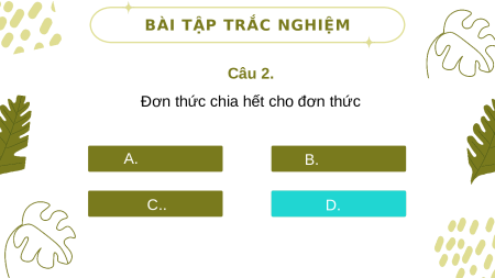 Đơn thức chia hết cho đơn thức A. B. C.. D.