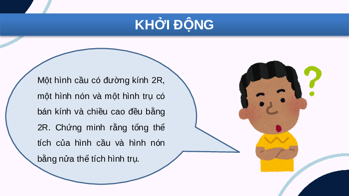 bằng nửa thể tích hình trụ. KHỞI ĐỘNG Giải: Ta có: V = cầu V = nón V = trụ Khi đó V + V = V cầu nón trụ BÀI TẬP CUỐI CHƯƠNG X