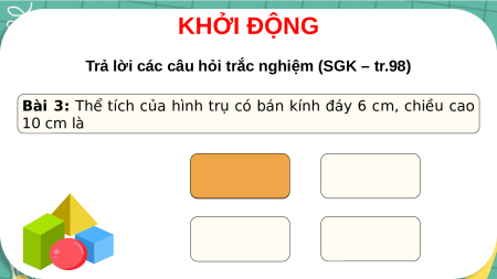 Bài 3: Thể tích của hình trụ có bán kính đáy 6 cm, chiều cao 10 cm là