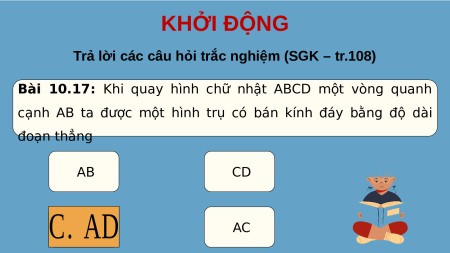 cạnh AB ta được một hình trụ có bán kính đáy bằng độ dài đoạn thẳng AB CD AD AC C. AD KHỞI ĐỘNG