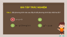 Câu 1. Bất phương trình nào sau đây là bất phương trình bậc nhất hai ẩn? A x + y > 3 B