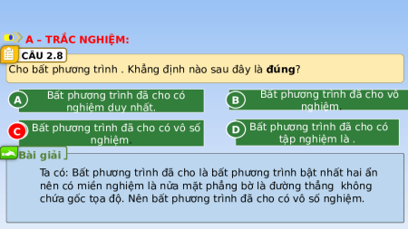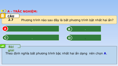 Theo định nghĩa bất phương trình bậc nhất hai ẩn dạng nên chọn A. A – TRẮC NGHIỆM: CÂU 2.8