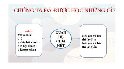 CHÚNG TA ĐÃ ĐƯỢC HỌC NHỮNG GÌ? a=k.b QUAN Với a, b, k HỆ Nếu am và bm b 0 CHIA thì (a+b)m a chia hết cho b Nếu am và bm a là bội của b HẾT thì (a+b) m b là ước của a