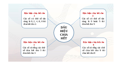 Các số có chữ số tận cùng là 0, 2, 4, 6, 8 thì cùng là 0 hoăc 5 thì chia hết cho 2. chia hết cho 5 DẤU HIỆU CHIA HẾT