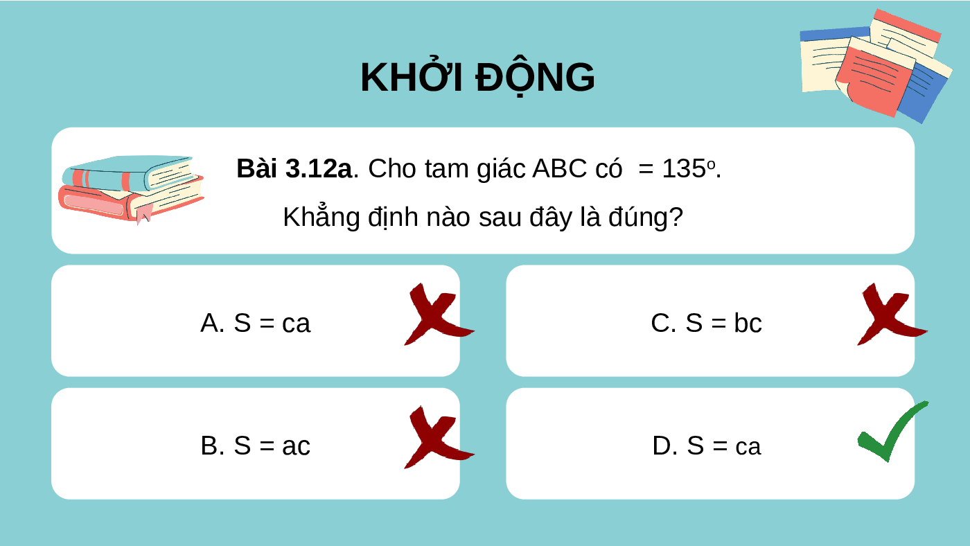 Khẳng định nào sau đây là đúng? A. S = ca C. S = bc B. S = ac D. S = ca