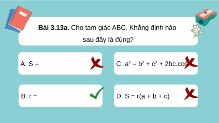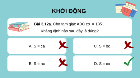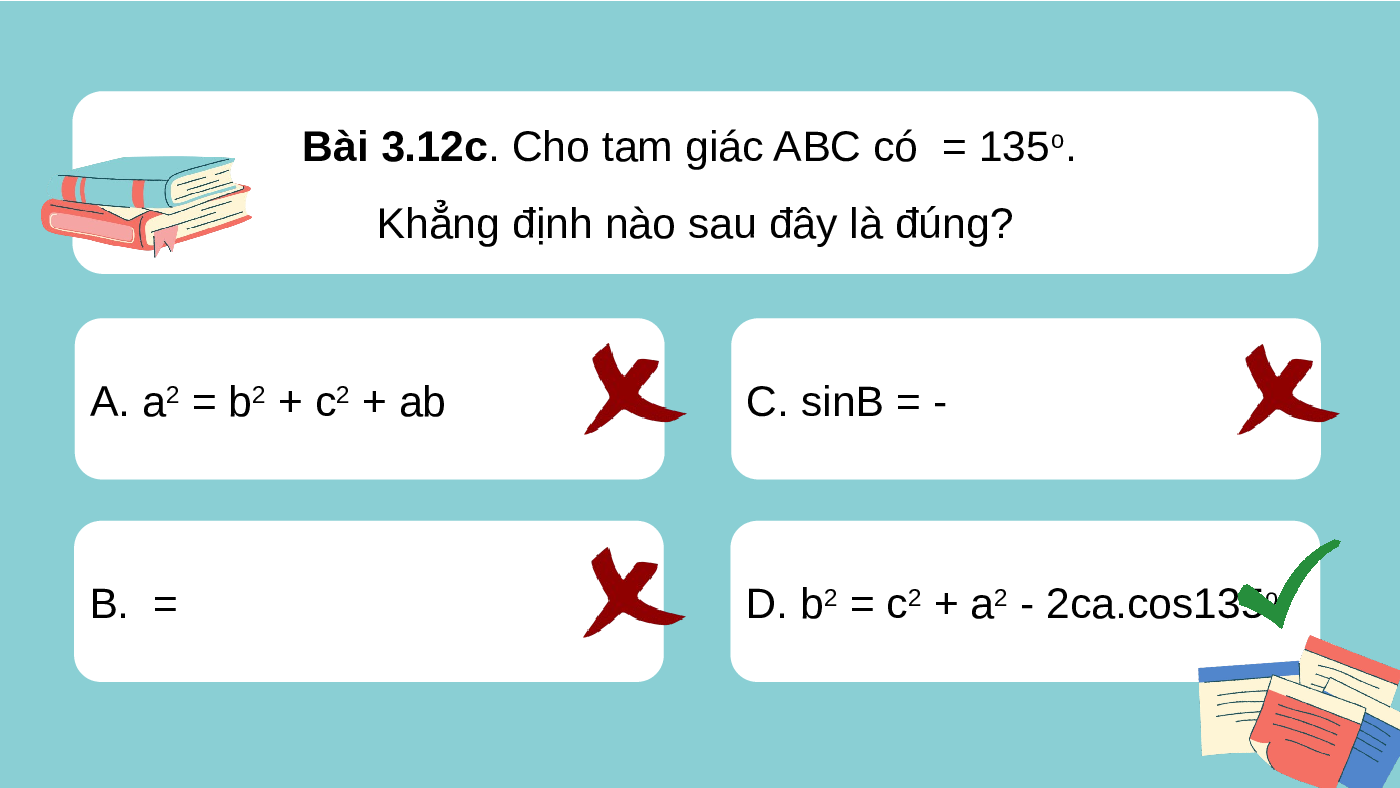 Khẳng định nào sau đây là đúng? A. a2 = b2 + c2 + ab C. sinB = - B. = D. b2 = c2 + a2 - 2ca.cos135o