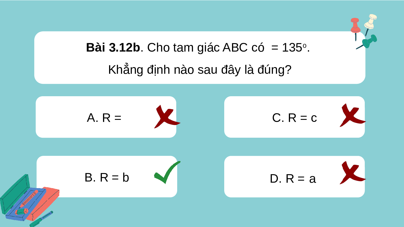 Khẳng định nào sau đây là đúng? A. R = C. R = c B. R = b D. R = a