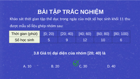 3.8 Giá trị đại diện của nhóm [20; 40) là A. 10 B. 20 C. 30 D. 40