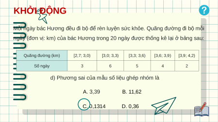 ngày (đơn vị: km) của bác Hương trong 20 ngày được thống kê lại ở bảng sau: Quãng đường (km) [2,7; 3,0) [3,0; 3,3) [3,3; 3,6) [3,6; 3,9) [3,9; 4,2) Số ngày 3 6 5 4 2