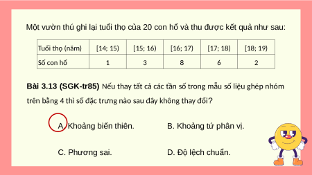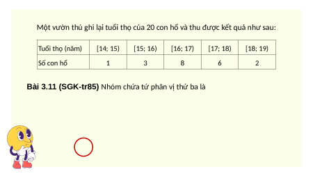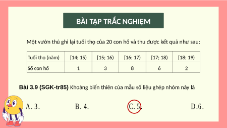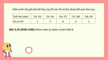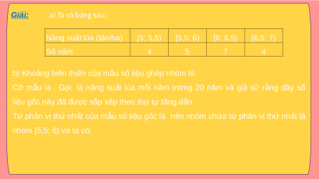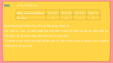 Ông An ghi lại năng suất lúa sau 20 năm thu được kết quả như sau: 5,2 6,3 6,3 6,2 6 6,1 5,7 5,4 6,5 5,3 5,1 5,5 6,3 5,9 6,8 6,5 6,7 6,4 5,7 5,8