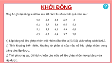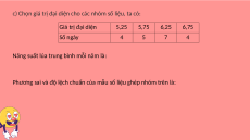 c) Tính phương sai, độ lệch chuẩn của mẫu số liệu ghép nhóm trong bảng vừa lập được. Giải: a) Ta có bảng sau: Năng suất lúa (tấn/ha) [5; 5,5) [5,5; 6) [6; 6,5) [6,5; 7) Số năm 4 5 7 4