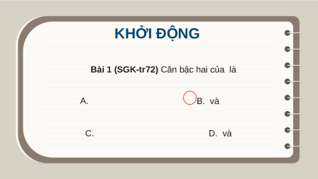 Bài 1 (SGK-tr72) Căn bậc hai của là A. B. và C. D. và KHỞI ĐỘNG