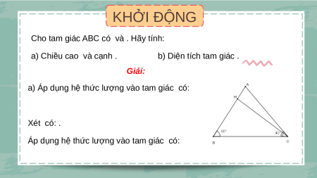 Cho tam giác ABC có và . Hãy tính: a) Chiều cao và cạnh . b) Diện tích tam giác . Giải: